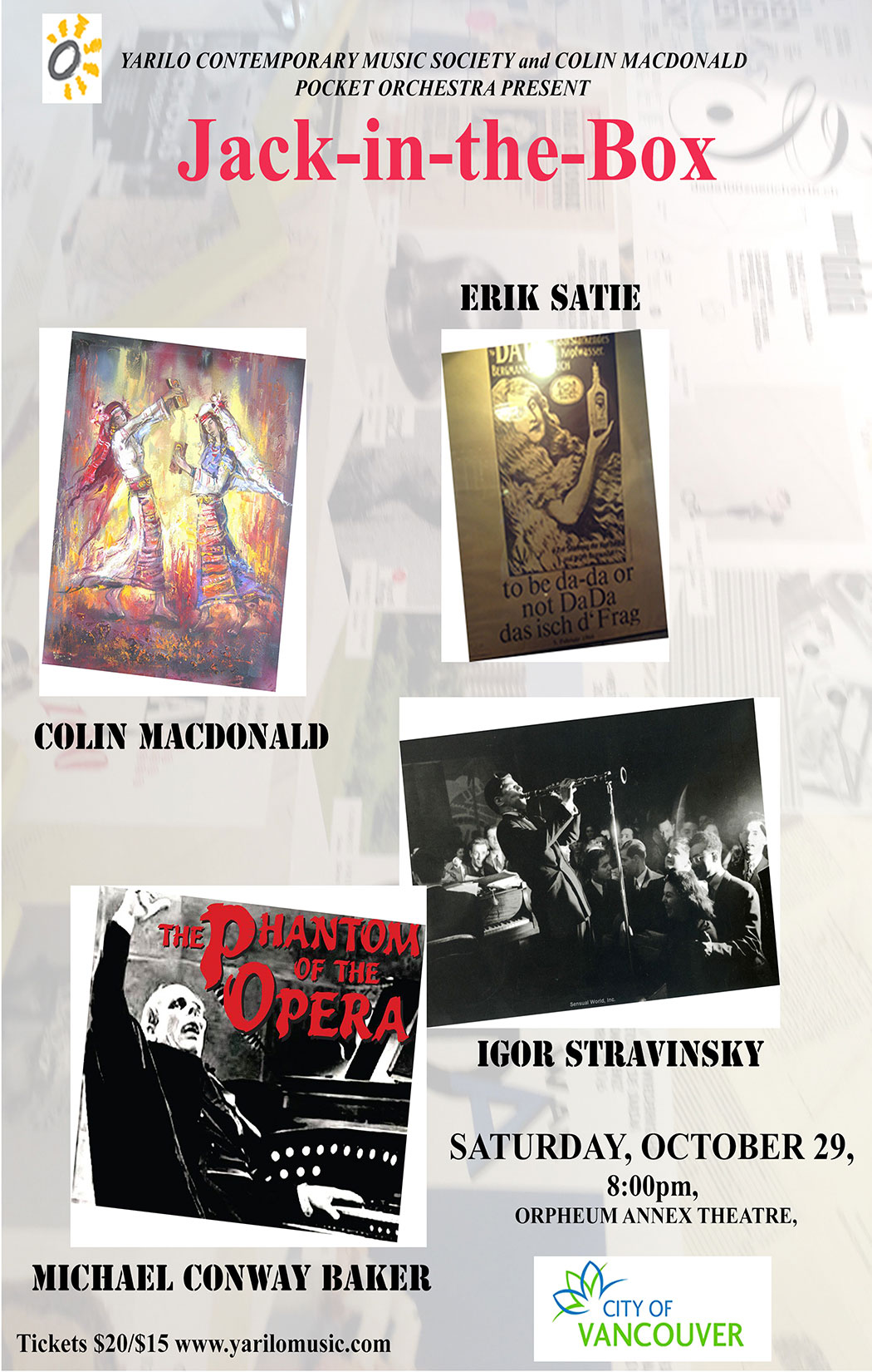 Our “Jack in the Box” is a musical journey back in time in which we re-envision the atmosphere of some of history’s entertainment hotspots. We will begin in the smoky cafes of turn of the century Paris in the heady days of Toulouse Lautrec, Cancan girls and the music of Erik Satie. The “Grande ritornelle” from Satie’s “La Belle Excentrique” serves as a promenade as we dance our way from Paris with Satie’s ballet “Jack-in-the-Box” to the early cinema and Michael Conway Baker’s “Phantom of the Dance,” a musical retelling of the silent film classic. Dance is the common theme as we move next to a public square for a moving celebration in an Eastern European village with a new commission by Colin MacDonald. Finally, we cross the globe to revisit the clubs of New York and Los Angeles during the Swing Era, with a performance, of Igor Stravinsky’s jazz classic, “Ebony Concerto.” Satie provides our musical guide on route.